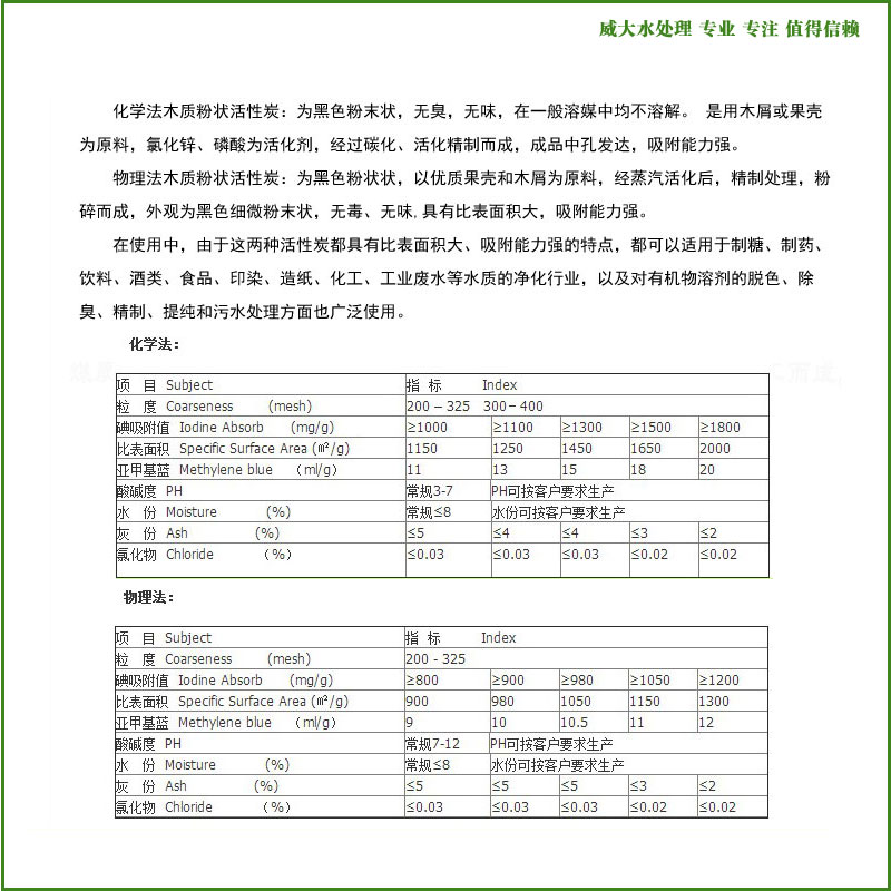 踏踏實實,弘揚匠人精神!兢兢業(yè)業(yè),塑造民族品牌!感謝您關(guān)注威大水處理官網(wǎng)木質(zhì)粉狀活性炭產(chǎn)品信息,也歡迎您提出寶貴的意見,共同推進中國制造的國際競爭力!對威大木質(zhì)粉狀活性炭若有疑問的地方,請撥打威大技術(shù)工程師電話: